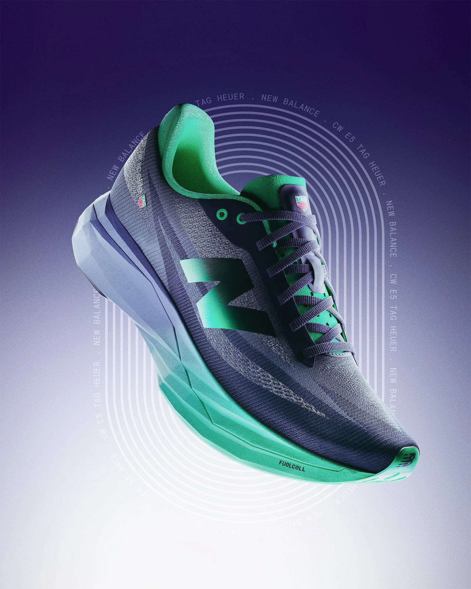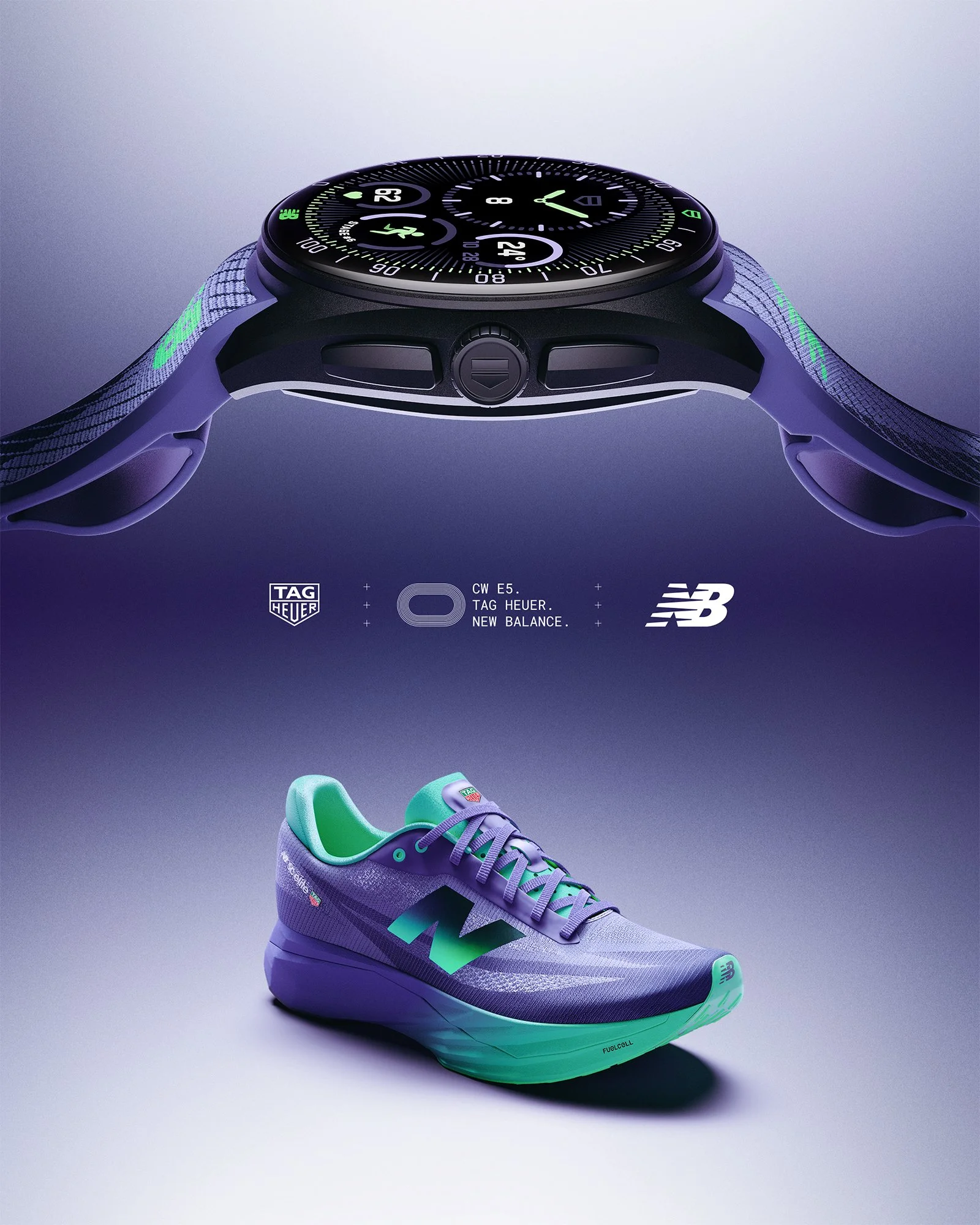 The co-branded campaign’s art direction brings together the distinct worlds of TAG Heuer and New Balance, uniting precision with athletic energy in a cohesive visual universe. A soft purple gradient, inspired by the collaboration’s signature tone, sets the stage, with a hint of analog texture to contrast the watch’s digital precision. Subtle graphics reference running and watch interface data, adding texture and context.